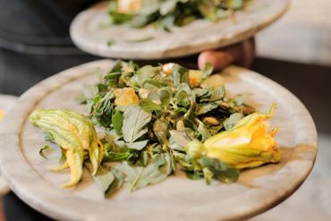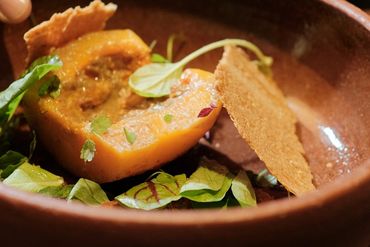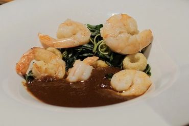 Opción 2: Camarones a la plancha sobre puré de berenjena, chilacayote, ajo y chepiche, acompañados de quelites aderezados con aceite de chile.